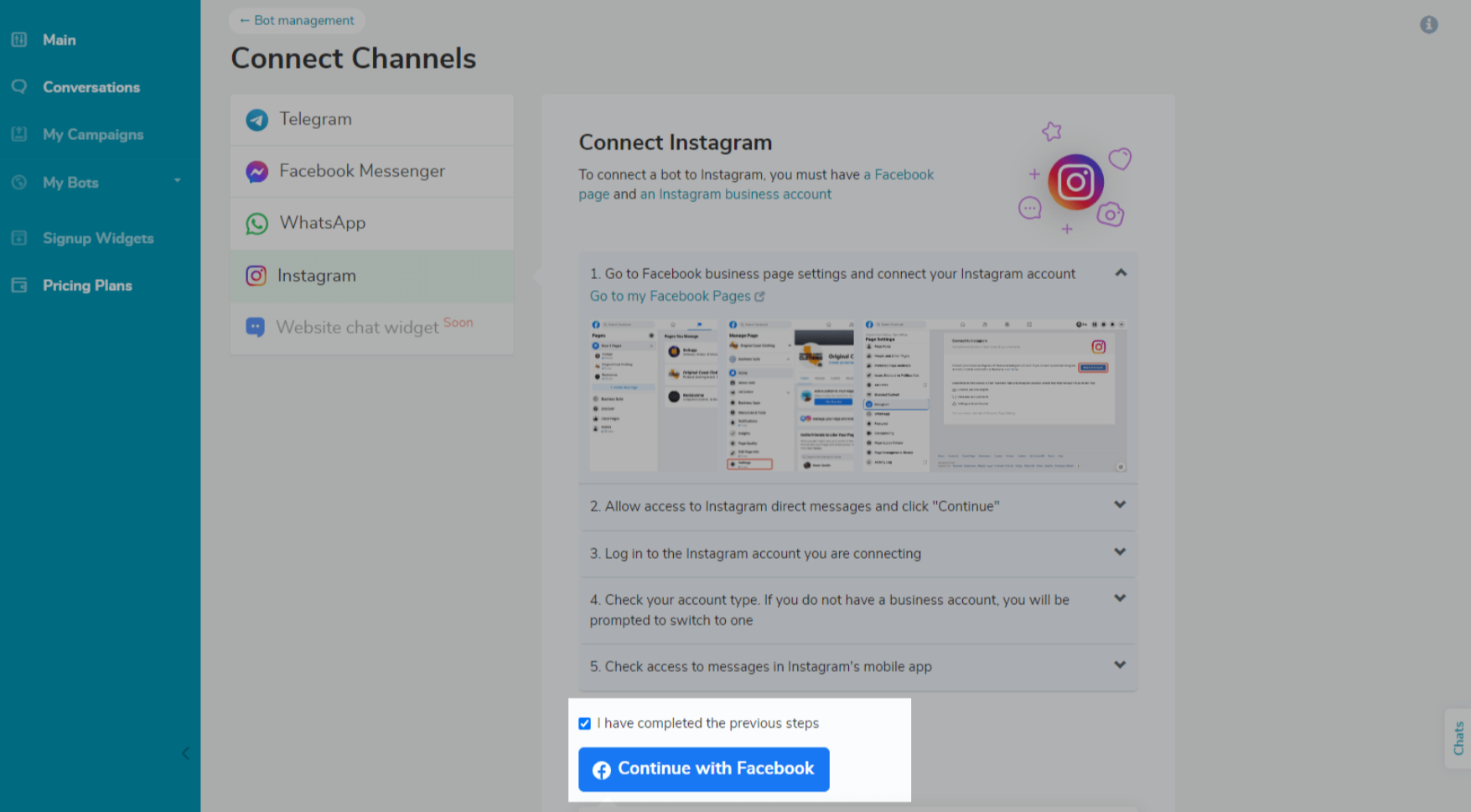 Зареєструйтесь у SendPulse, якщо у вас ще немає облікового запису. Щоб підключити чат-бота до вашого Instagram-акаунту, вам потрібна сторінка компанії у Facebook, бізнес-акаунт у Instagram, особистий профіль у Facebook, другий особистий обліковий запис у Instagram.