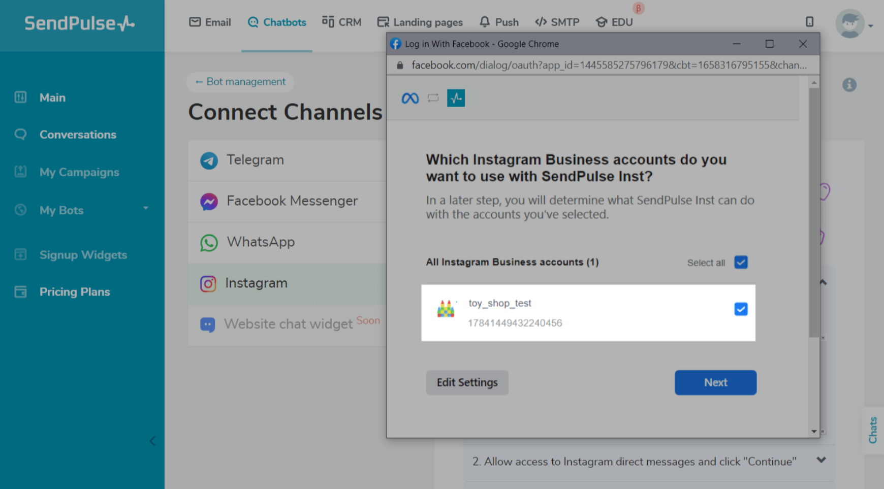 Виберіть обліковий запис, для якого ви будете створювати бота, та пов'язану сторінку компанії у Facebook.
