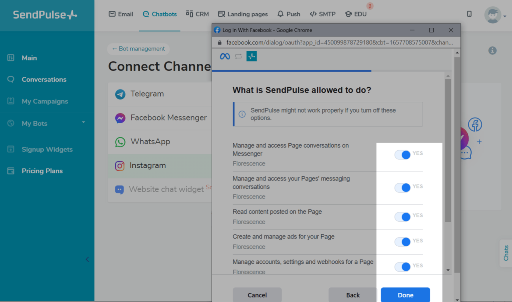 Надайте дозволи SendPulse та натисніть «Готово» (Next).