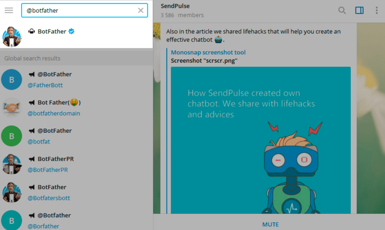 Відкрийте Telegram і введіть BotFather у рядку пошуку. Зверніть увагу, що офіційний бот має синю галочку.