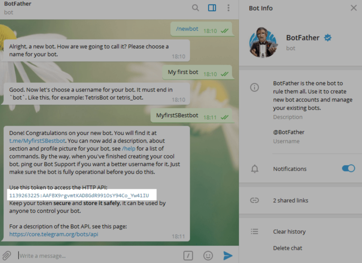 Вам необхідно ввести команду /newbot, а далі вказати назву свого бота та ім'я користувача для нього. Після цього ви отримаєте повідомлення з токеном доступу, який потрібно скопіювати. Токен доступу виділено на скриншоті нижче.