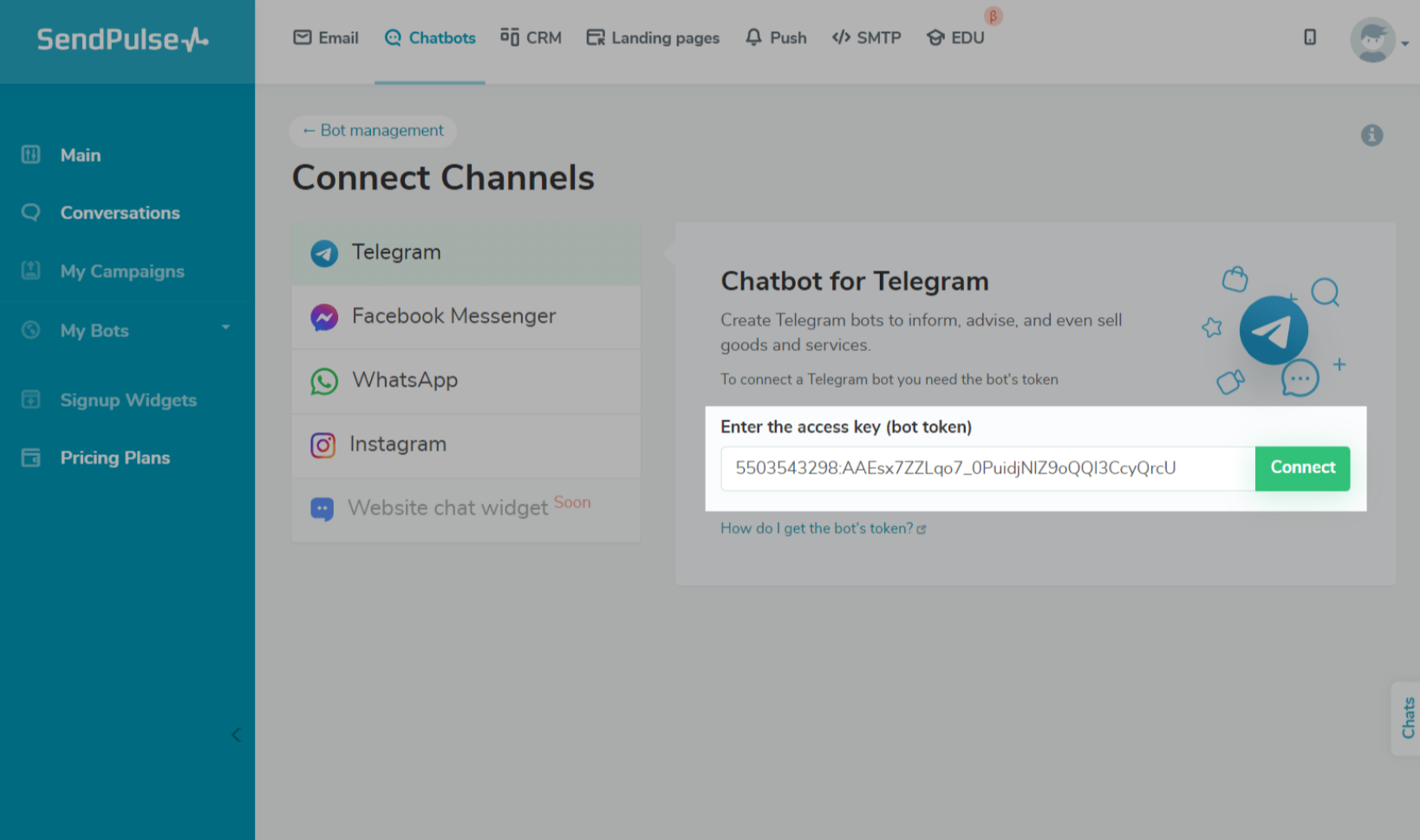 Тепер відкрийте особистий кабінет SendPulse. Перейдіть до розділу «Чат-боти» (Chatbots), вставте скопійований ключ доступу в спеціальний рядок біля каналу Telegram і натисніть «Підключити» (Connect).