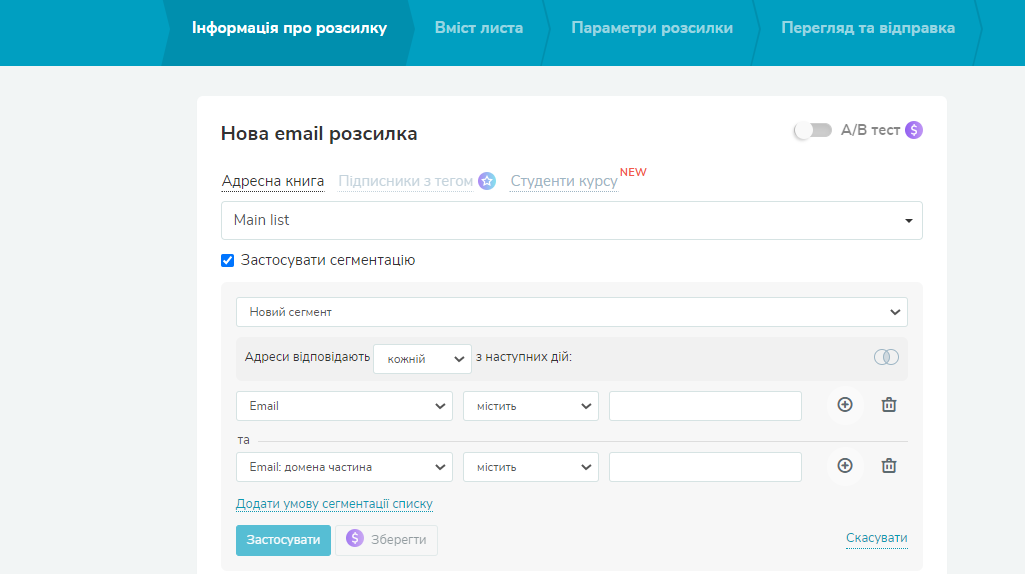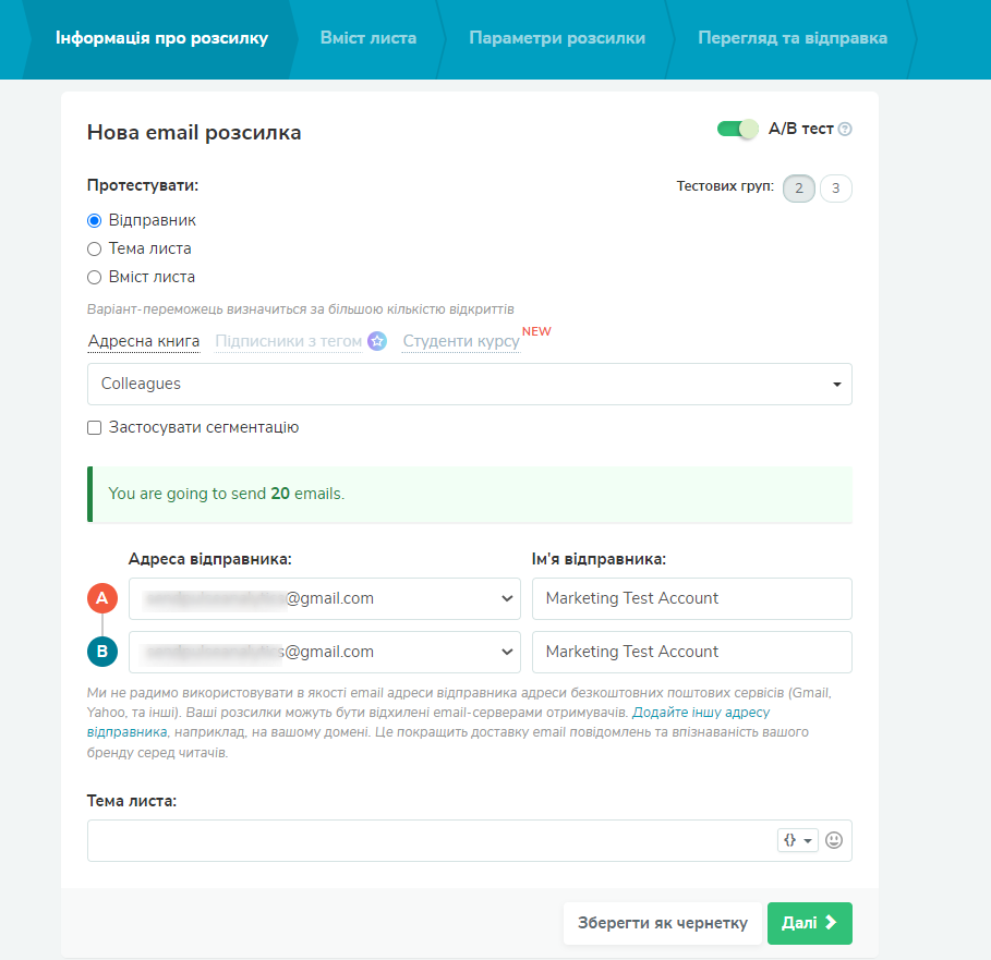 В SendPulse на першому етапі створення розсилки ви можете переключитися на A/B тестування і обрати потрібний критерій.