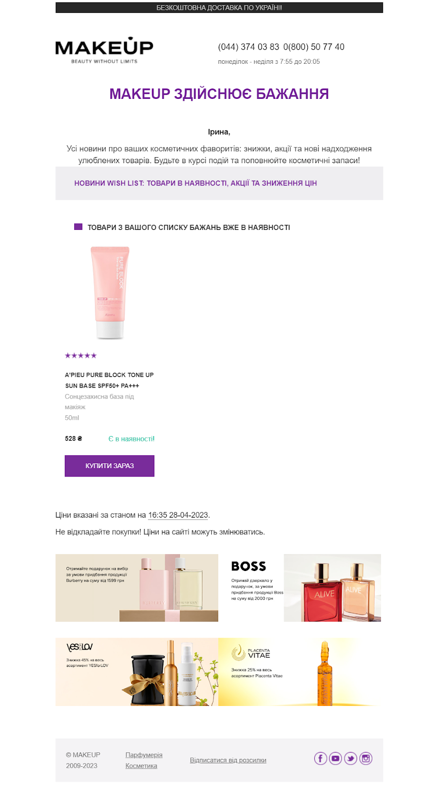 MAKEUP інформує користувачів, коли бажаний товар з’являється в наявності і вказує актуальну ціну, що змушує клієнта швидко прийняти рішення.