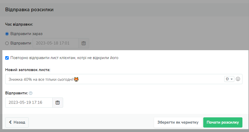 На останньому етапі створення розсилки ви можете скористатися цією функцію. Напишіть нову тему листа та виберіть дату відправки.