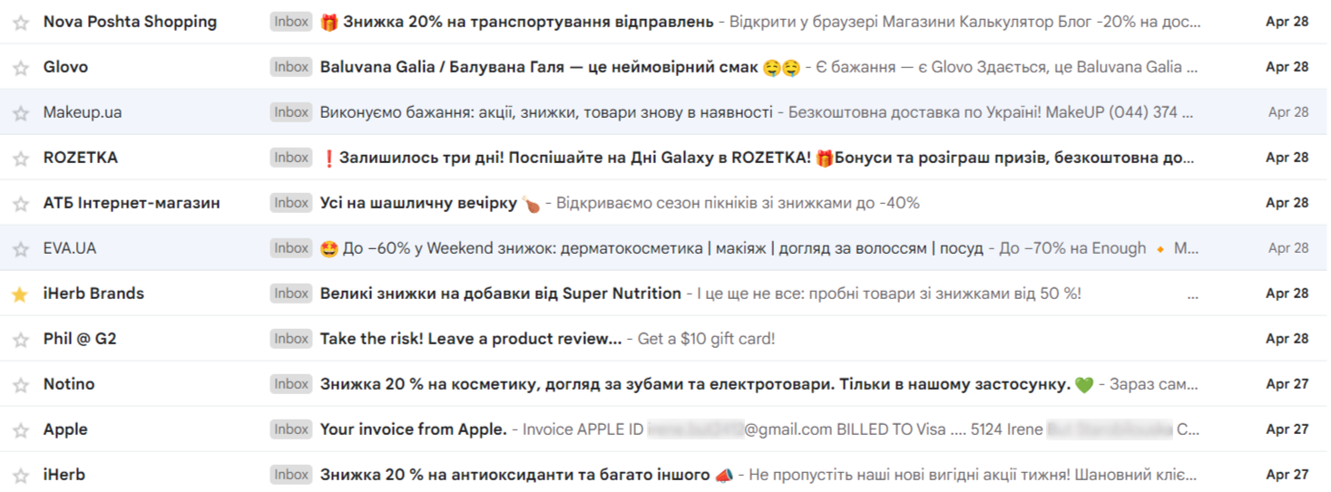 На скріншоті нижче ви бачите, що відомі бренди вказують свою назву або ім’я і компанію, щоб підписники одразу розуміли, від кого лист.