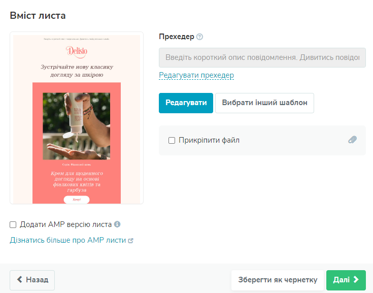 Наш сервіс пропонує вам додати прехедер під час створення розсилки.