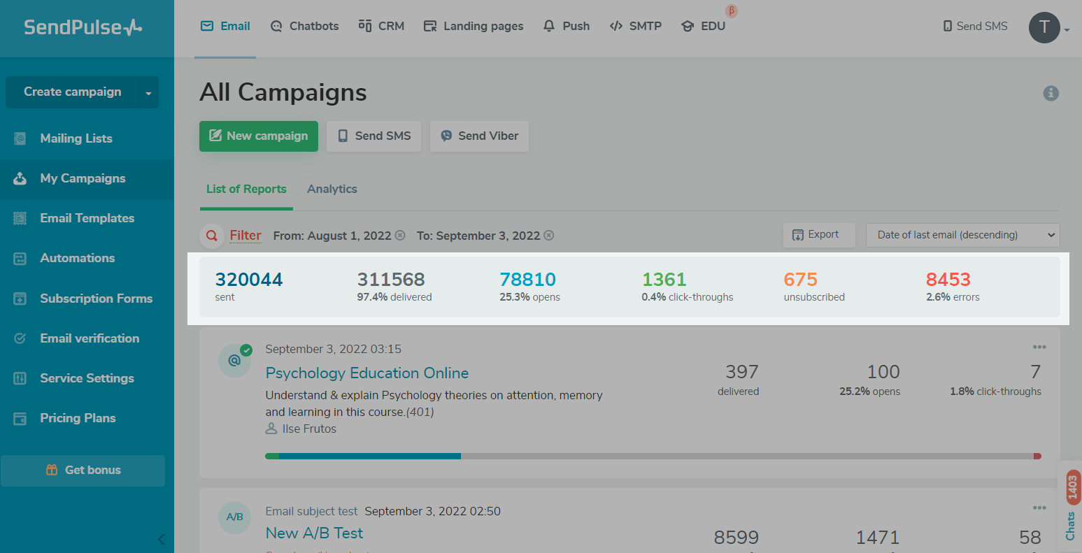 Щоб переглянути докладну статистику у своєму обліковому записі SendPulse, перейдіть до розділу «Мої розсилки» та виберіть одну зі своїх кампаній. Тут ви можете побачити кількість відправлених та доставлених листів, open rate, CTR, відписки та помилки. Всі дані можна експортувати у PDF-файл або XLS формат.