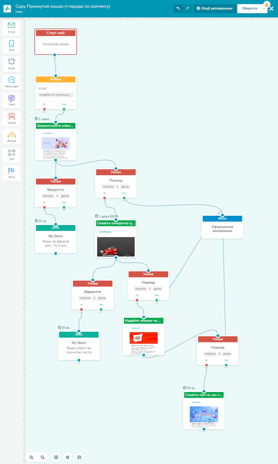 Внизу ви бачите приклад ланцюжка повідомлень, який відправляється користувачу автоматично після того, як він додає товар в кошик і не купує. Таким чином ви можете підвищити продажі, автоматично нагадуючи клієнтам про незавершену покупку. Побудувати такий ланцюжок можна безплатно за допомогою Automation 360, використовуючи вже готовий шаблон для події “Покинутий кошик”.