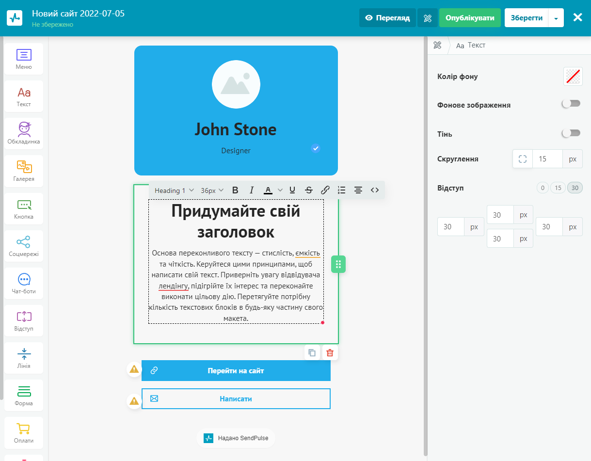 Створення сайту або лендінгу в SendPulse відбувається аналогічно до створення шаблону розсилки. Ви можете обрати готовий шаблон або створити власний з нуля. Додавайте меню, галерею, текст, обкладинку, кнопки, підписку на ваші чат-боти або email розсилку можливість оплати. Ви також можете використовувати нашу CRM. Таким чином, адреси та інша інформація про клієнтів буде автоматично додаватися у CRM у вигляді угоди. Ви зможете відстежувати статуси угод та всю роботу ваших агентів з ними.