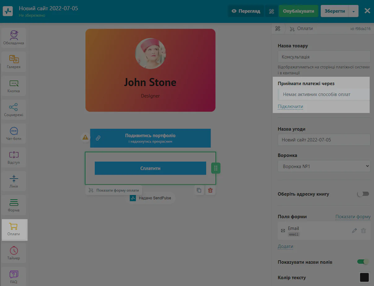 В SendPulse ви можете створити один сайт, що включає до 50 сторінок безплатно. Якщо ви хочете приймати платежі від користувачів, вам треба перейти на платний тариф, який коштує 440 грн на рік ($12).