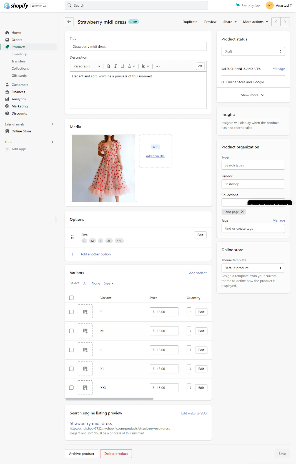 Редактор дуже простий у використанні. До того ж, не обов’язково створювати з нуля кожну наступну картку товару, оскільки можна їх дублювати. Доступні SEO налаштування, детальна аналітика, можливість додавання різних каналів продажу. Але на базових тарифах функціонал дуже обмежений.